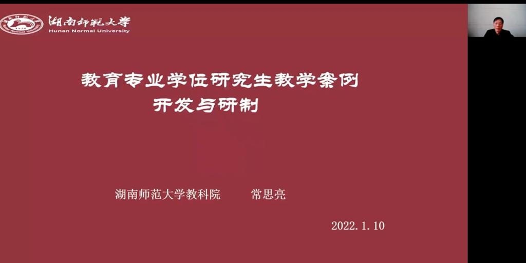 2022年1月10日上午,我院第11期“教育名家讲坛”在线上举行。湖南师范大学常思亮教授应邀开讲,讲座主题为“教育专业学位研究生教学案例开发与研制的探索”。职业教育教师学院副院长刘海兰教授主持讲座,我院教师及全校教育硕士100余人在线聆听。