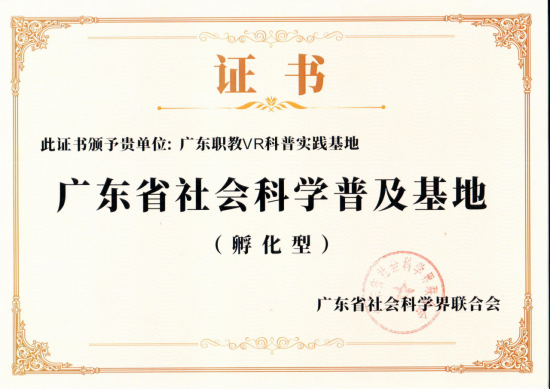 据悉,“广东职教VR科普实践基地”是此次我校获评“广东省社会科学普及基地”的3个单位之一。我校申报的“非遗传承大师工坊科普基地” 获批广东省人文社会科学普及标准基地,“广东省农业人工智能科普教育基地” 获批广东省人文社会科学普及提升型基地,“广东职教VR科普实践基地”获批广东省人文社会科学孵化型基地。