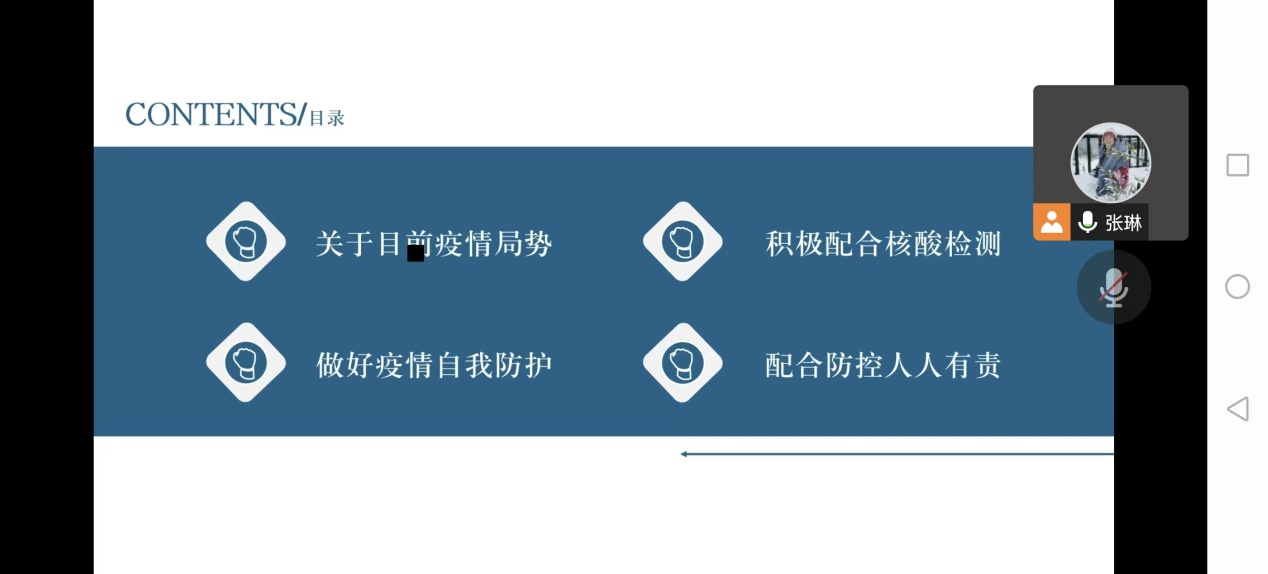 会议上,辅导员张琳老师围绕着“万众一心,战胜疫情”的主题,从目前疫情局势、积极配合核酸检测,做好疫情自身防护、配合防控人人有责等四个方面层层递进地展开阐述,强调了进一步落实疫情防控工作的重要意义。呼吁各班级班长将会议内容及精神传达到位,呼吁大家配合做好疫情防控工作,确保师生的身心健康及生命安全。