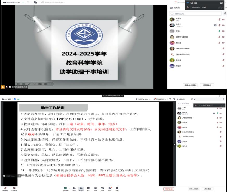 为了进一步优化助学服务工作,我院勤工助学服务中心于2025年3月2日晚上八点召开了一场2024级新生助学干事线上培训会。本次会议主要分为5个环节,分别是:学院领导及学院助理团介绍、 明确助学干事具体职责、列举助学工作的注意事项、详细介绍助学工作的时间安排、分享助学工作经验并对助学干事提出的问题一一解答。这次会议不仅让助学干事更明晰自身工作职责,还提高了助学工作小组的合作能力,便于我院后续助学工作的顺利开展。