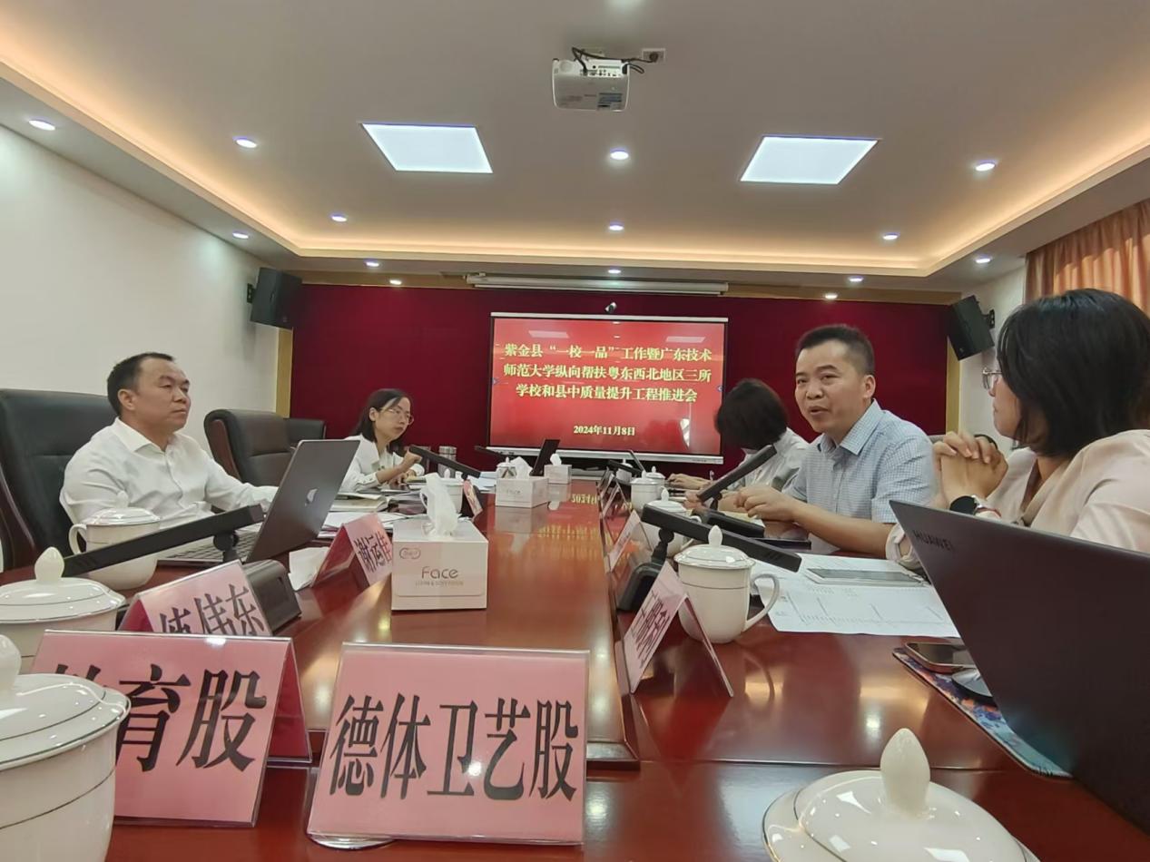 为深入贯彻落实《广东省师范院校纵向帮扶欠发达地区“三所学校”和县中质量提升工作方案(2024-2027年)》,扎实推进广东技术师范大学与河源市签订的《师范院校纵向帮扶“三所学校”和县中框架协议》《全方位全口径融入式结对帮扶协议(2021-2025 年)》落地见效,11月6日至8日,我校royal皇家88平台专家组一行13人前往紫金县调研,与紫金县教育局共同召开“师范院校纵向帮扶粤东西北地区三所学校和县中质量提升工程暨一校一品”工作推进会。河源市教育局副局长黄汝荐、河源市教师发展中心主任助理谢运佳、紫金县教育局副局长谢晓玲、德体卫艺股、教育股负责人、我校royal皇家88平台杨定玉教授、曹宇星副教授、付平博士、王朋利博士、钟佳容博士以及相关中小学(幼儿园)书记、校长(园长)出席会议。会议由紫金县教育局谢晓玲副局长主持。