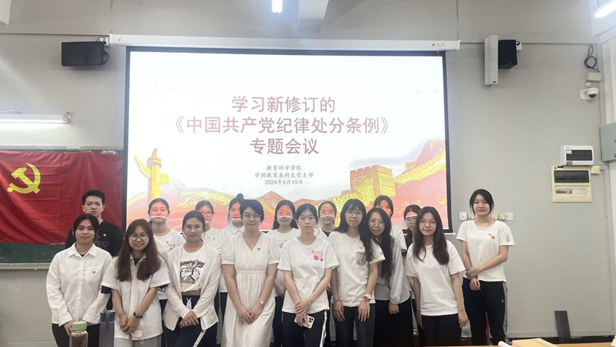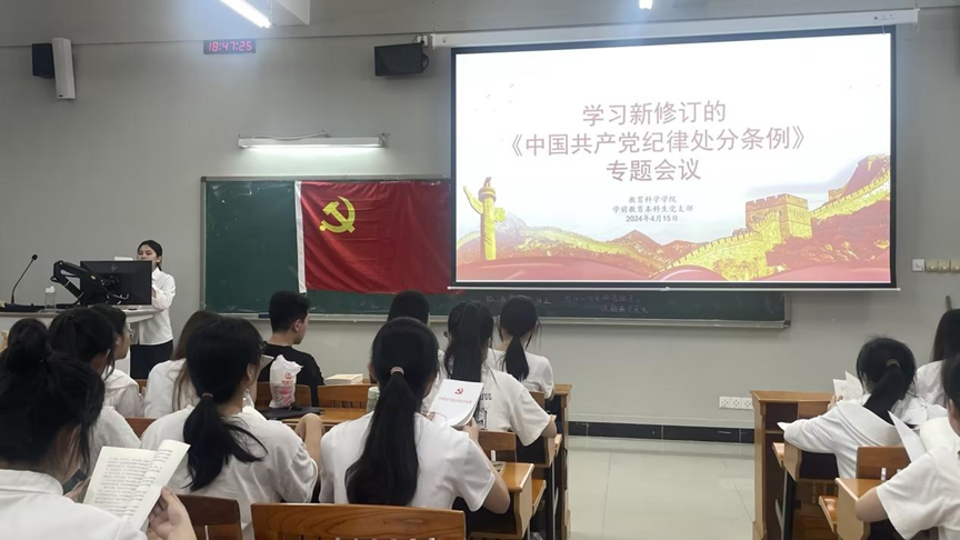 根据中央关于在全党开展党纪学习教育的部署要求,认真学习贯彻新修订的《中国共产党纪律处分条例》,引导党员牢固树立党规党纪意识,坚守纪律底线。4月15日,royal皇家88平台学前教育本科生党支部在三教407课室组织召开《中国共产党纪律处分条例》(以下简称《条例》)专题学习会议。会议由学前教育本科生党支部学生副书记林纯同志主持,全体党员参加会议。