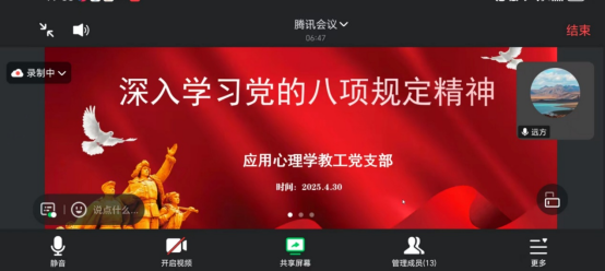 为深入贯彻落实党中央关于改进工作作风、密切联系群众的部署要求,持续推进党风廉政建设,4月30日晚上19:30,广东技术师范大学royal皇家88平台应用心理学教工党支部通过腾讯会议平台召开“深入学习贯彻中央八项规定精神”专题组织生活会。会议由支部书记张玲燕主持,学院党委委员、副院长冯帮应邀作专题辅导,全体党员教师参会学习。