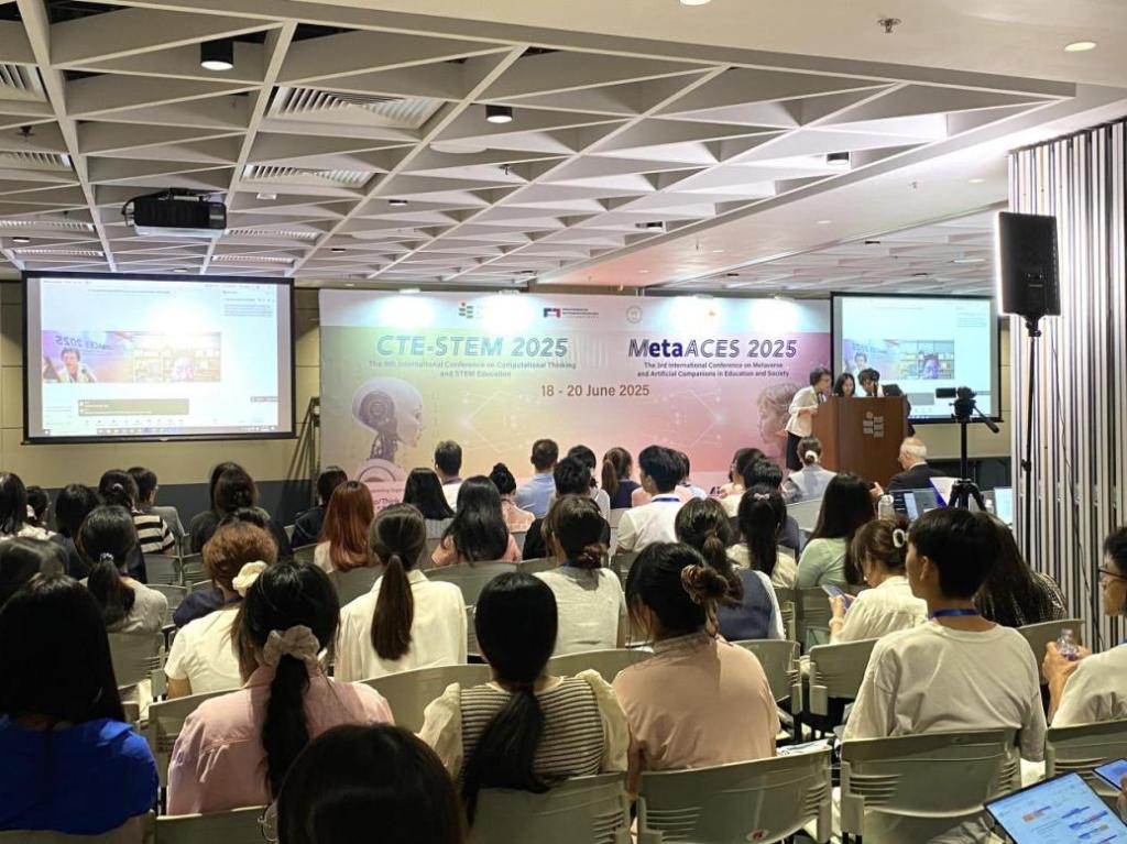 6月18日下午,师生代表深度参与在香港教育大学举办的CTE-STEM & MetaACES 2025国际学术会议。本次会议汇聚海内外教育技术领域顶尖学者,华东师范大学祝智庭教授带来的首场主旨报告《AI时代人技共智共创的创新框架》,为师生解锁了人工智能重塑教育生态的前沿密码。报告中,祝智庭教授立足“通用人工智能(GenAI)重构教育生产力”的时代语境,系统阐释“人技共智共创”创新框架的核心理念——在技术深度融入教育场域的当下,需突破“工具化应用”思维惯性,构建“人类智能与人工智能双向协作、认知共创”的教育新范式。并结合中小学AI教育实践案例,从“教学目标动态适配、学习资源智能生成到评价反馈精准迭代”等维度,具象化呈现“认知协作、文化共创、生态共建”的实践路径,让抽象的理论框架成为可感知的教育创新图景,为师生打开教育数字化转型的全球视野。