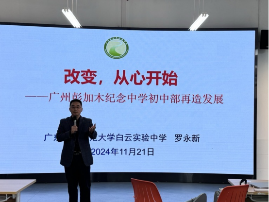 罗永新校长2024年11月21日下午白云校区第二实训楼311开展了一场以“改变,从心开始——广州彭加木纪念中学初中部再造发展”为主题的讲座。